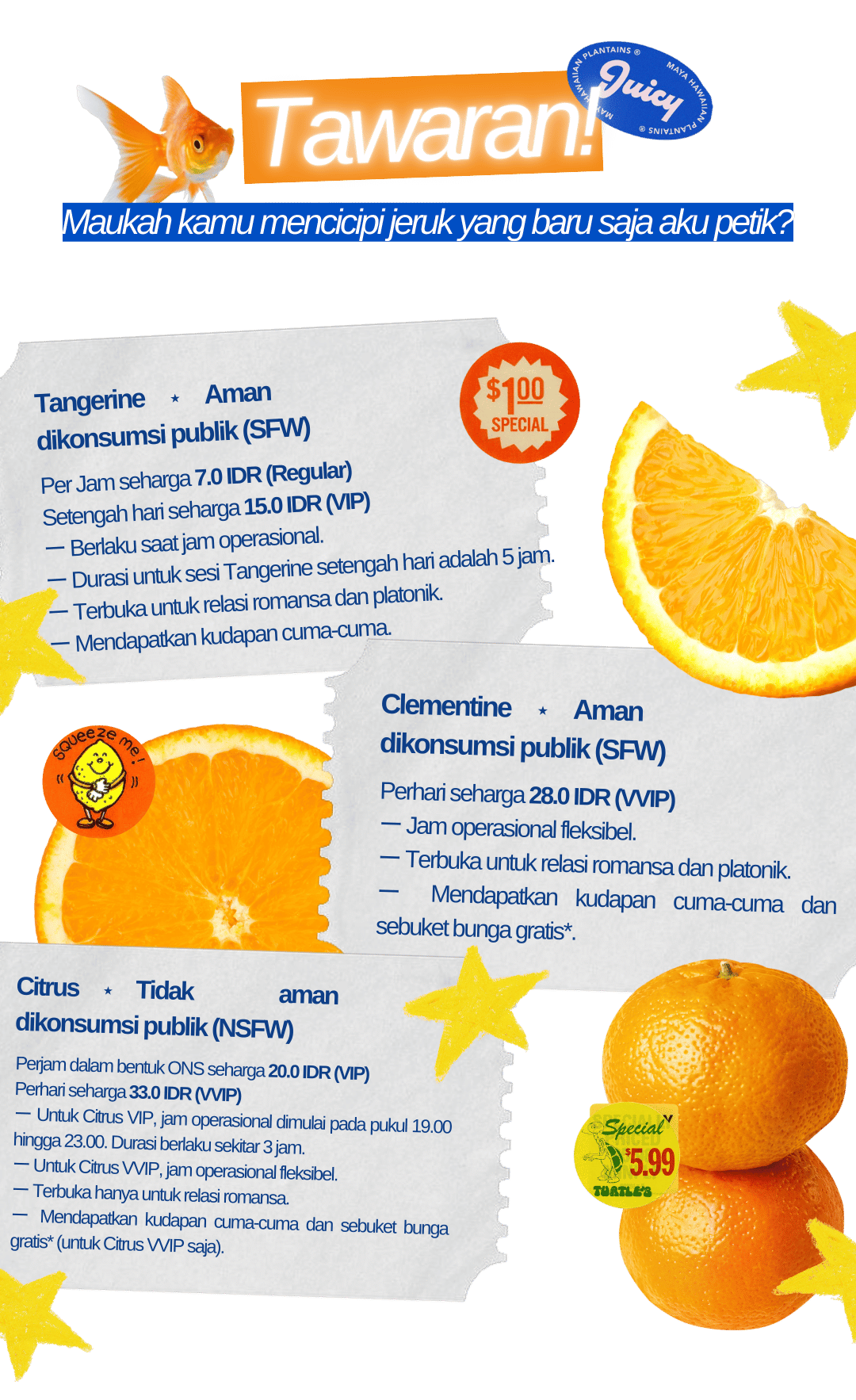Nama paket: (Tangerine Regular/VIP) / (Clementine VVIP) / (Citrus VIP/VVIP)