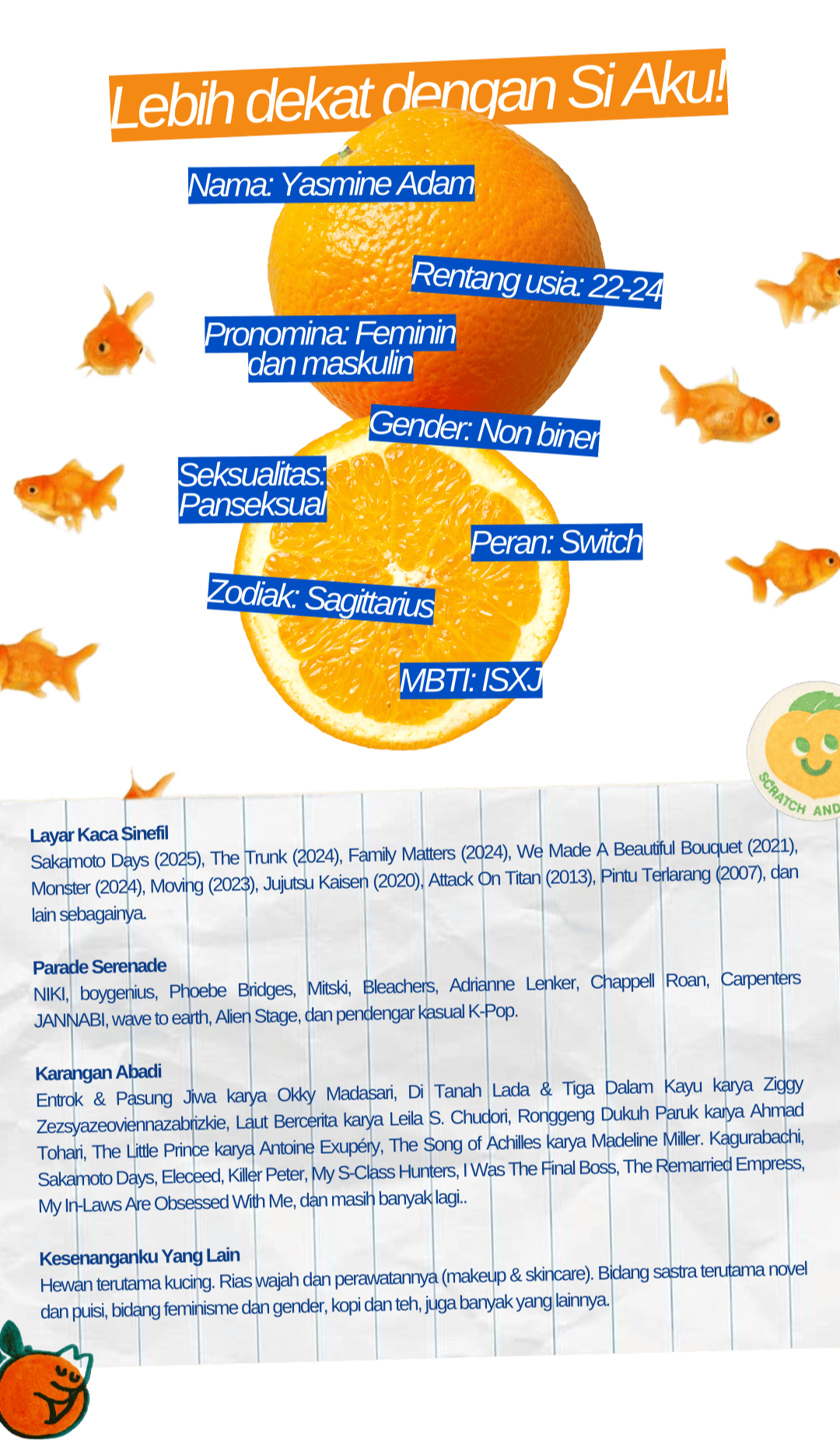 Jari-jariku menusuk kulit licin berwarna oranye, cairannya meleleh karena bulirnya tidak sengaja aku tekan terlalu keras. Buahnya ku potong menjadi beberapa bagian, hampir semuanya kuserahkan padamu yang asik mengunyah bulir-bulir segar itu. Tersisa satu bagian buah, tidak untukku makan namun akan kusimpan dalam kotak bernama kenangan.Caraku mencinta layaknya memakan buah jeruk, membuat kamu menerka-nerka akan semanis apa jika bulirnya pecah membasahi indra perasa. Bilamana si aku sedang berbunga-bunga, mulutku tidak henti bercerita tentang si kamu yang eksistensinya menggugah selera. Caraku mendamba seperti uliran putih yang mendekap di sela-sela buah jeruk, membuat nyaman karena selalu ada, selalu mendengar dan memahami kalau kamu terbuat dari segala baik dan kotornya cinta di dunia. Maka seperti kulit jeruk, akan ku peluk semuanya tanpa ampun. Agar kamu paham bahwa masih ada cinta baik di dunia ini, meski hanya sebesar buah jeruk, semoga hadirnya dapat membuat pikiran mengenai kamu yang tidak baik untuk diusahakan segera enyah dan menghilang.Perkenalkan namaku Yasmine Adam. Terbilang unik tapi ketahuilah, tidak ada makna yang spesial balik nama ini. Selain karena si empunya yang tergila-gila dengan segala wewangian melati dan nama Adam sendiri dipilih karena terkesan netral baginya yang seorang non biner.Tak kenal maka tak sayang, agar bisa sayang yuk kenalan!Ada beberapa panggilan yang disematkan untukku diantaranya; Yas, Iyas, atau Yasmine dan Adam. Panggilan manapun akan selalu membuat si aku menoleh karena kamu yang memanggil. Yang aku harapkan, semoga kehadiranku bisa menjadi pelipur lara. Entah sekadar sebagai teman makan siangmu atau seseorang yang bisa mengupas berbagai kulit buah-buahan agar si kamu tidak kerepotan.